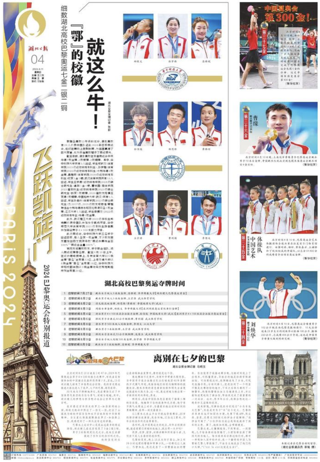 截至目前,湖北高校在本屆奧運會中共奪得7枚金牌、2枚銀牌、2枚銅牌。其中,華中科技大學共有3人出征,學生鄭欽文(體育學院2023級運動訓練本科生)、孫夢雅(體育學院2022級運動訓練本科生)分別奪得1枚金牌,昌雅妮(體育學院2020級運動訓練本科生)收獲1金1銅;武漢體育學院共有13人出征,學生王宗源(運動訓練學院2024級碩士研究生)拿到1金1銀,曹利國(競體學院2023屆本科生/運動訓練學院2023級碩士研究生)斬獲1枚銀牌,2020屆校友龐倩玉獲得1枚銅牌;中國地質大學(武漢)共有5人出征,學生孫佳俊(體育學院2023級碩士研究生)及2017級、2015級校友鄭思維/黃雅瓊組合分別奪得游泳和羽毛球混雙各1枚金牌;江漢大學1人出征,學生季博文(2022級運動訓練專業)奪得1枚金牌。