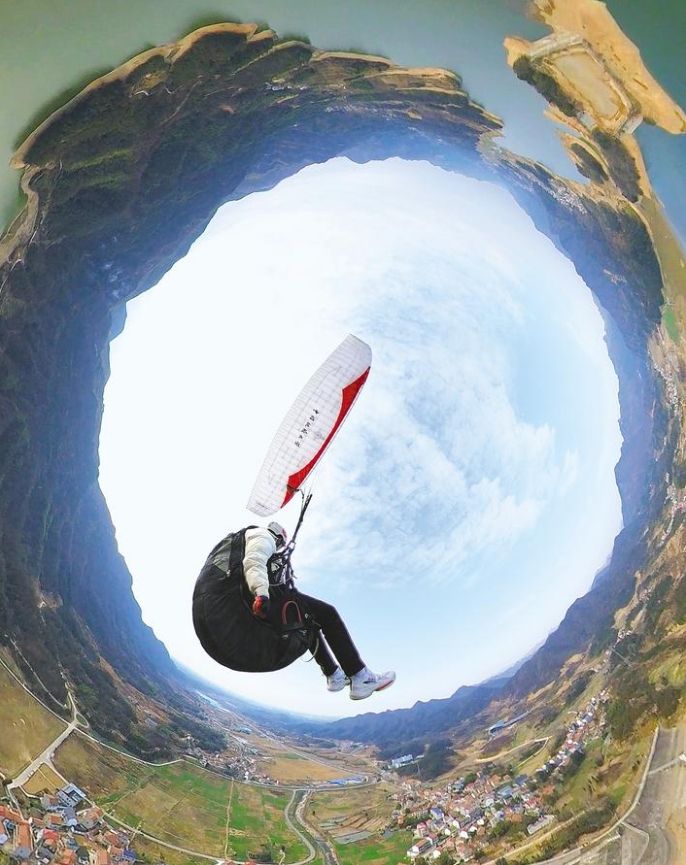 2月8日,在全景鏡頭下,空中的滑翔傘飛行員和天地融為一體。