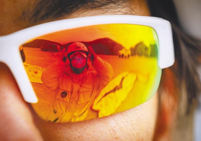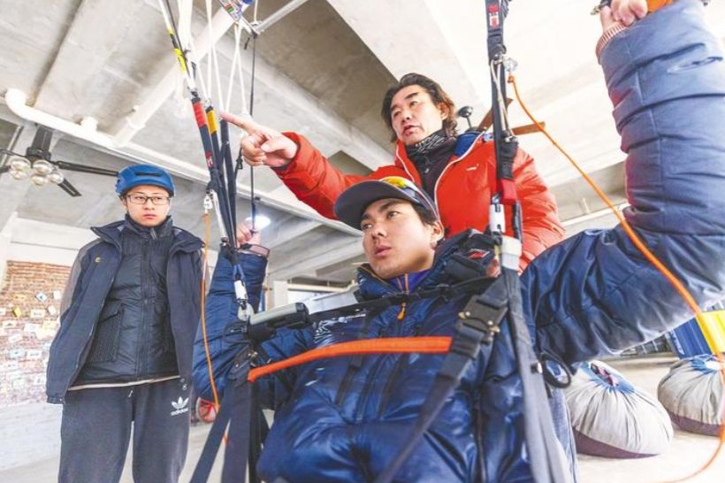 2月8日,起飛前,地大學生孟晴對著隊友炫酷的眼鏡調整頭盔。