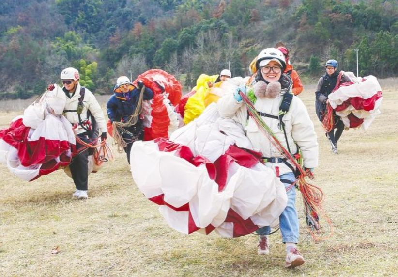如今,僅湖北境內,黃石、荊門、宜昌、咸寧等地,均有滑翔傘飛行體驗基地。在黃石大冶毛鋪,高峰時每年有千名體驗者“放飛”滑翔,最小體驗者僅有3歲,最大體驗者年齡超過60歲。