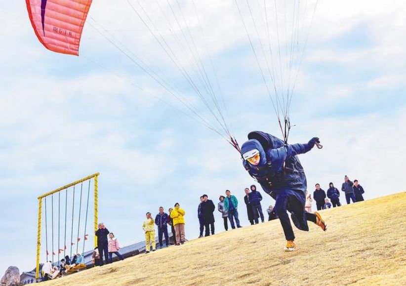 2月8日,大冶毛鋪滑翔傘基地起飛場,地大學生田茂宇在村民和游客的注視下拉緊傘繩,向懸崖邊奔跑、起飛。