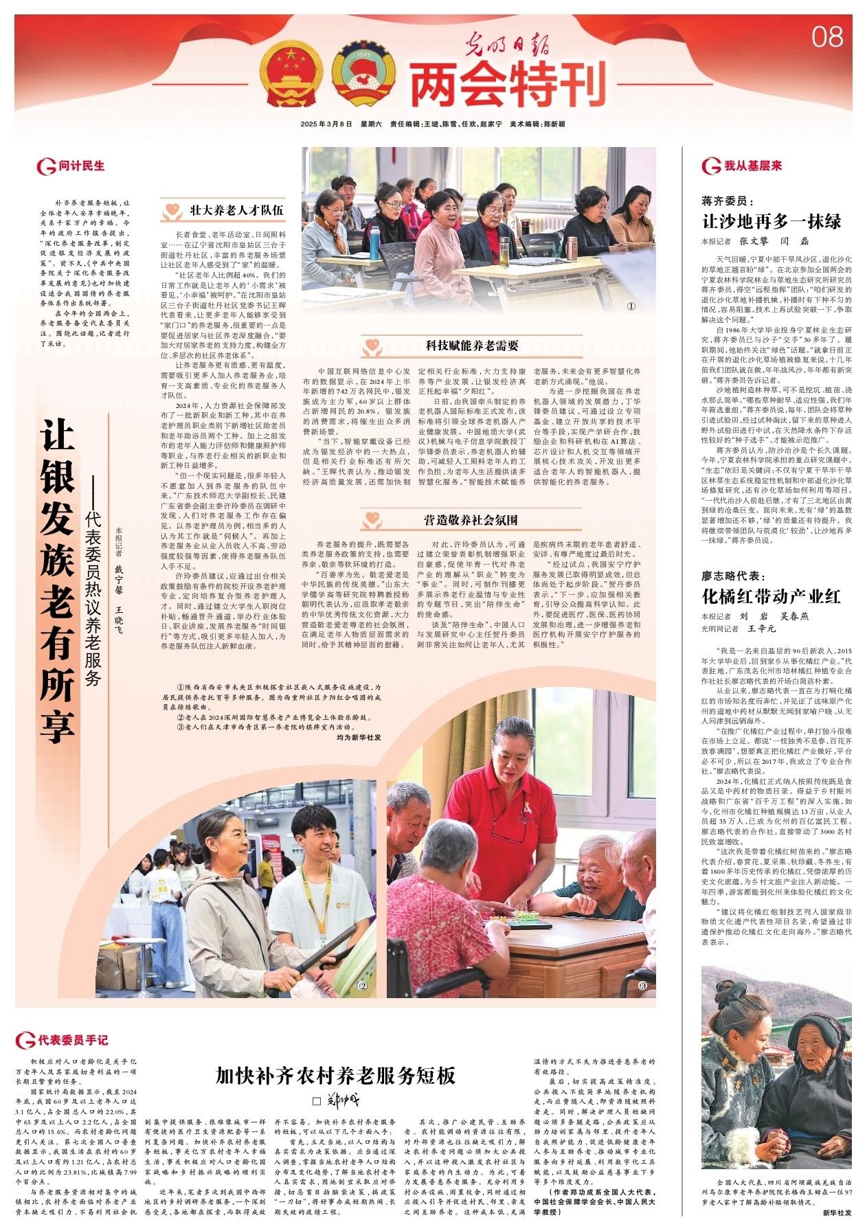 “當下,智能穿戴設備已經成為銀發經濟中的一大熱點,但是相關行業標準還有所欠缺。”王暉代表認為,推動銀發經濟高質量發展,還需加快制定相關行業標準,大力支持康養等產業發展,讓銀發經濟真正托起幸福“夕陽紅”。