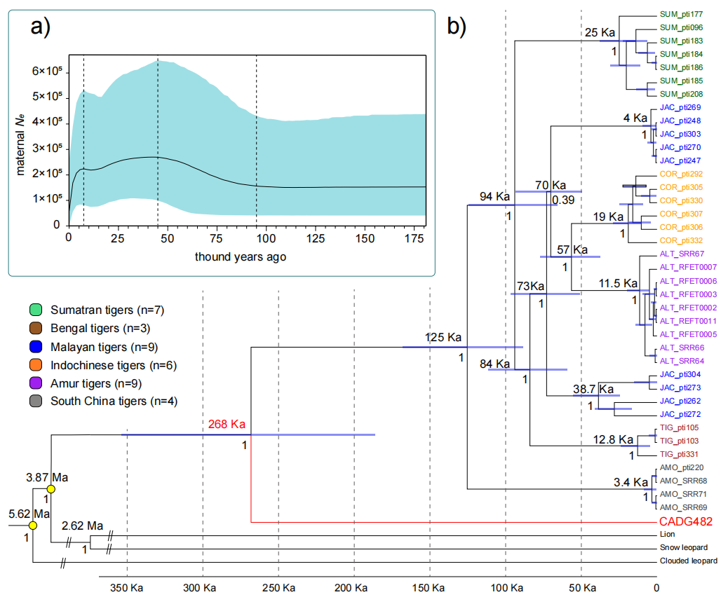 a) 老虎母系有效種群動(dòng)態(tài)變化; b) 老虎線粒體系統(tǒng)發(fā)育關(guān)系