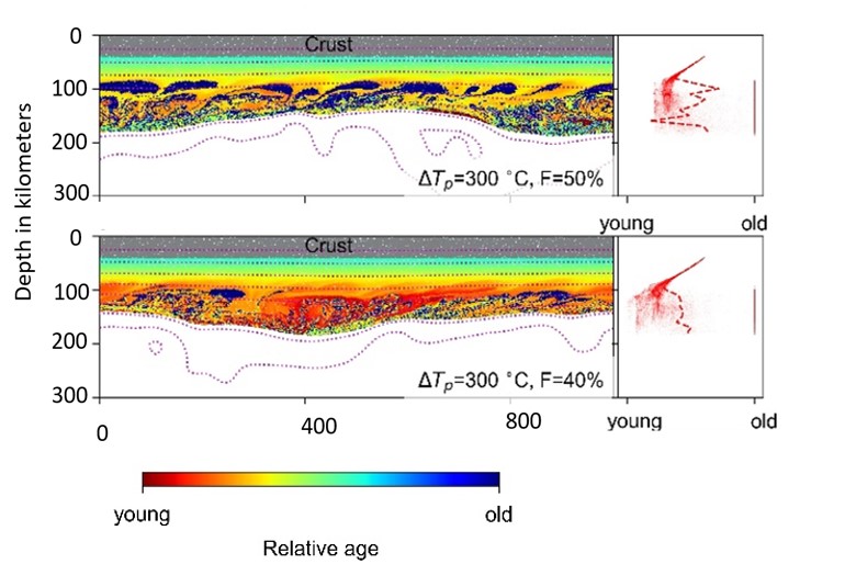 圖 3. 拆沉-浮合旋回形成的古老巖石圈底墊于新巖石圈之下或鑲嵌于新巖石圈內部的模型實例。拆沉-浮合旋回可以產生不同類型的巖石圈成分和年齡結構(詳情參見原文),可以合理解釋深源巖漿巖和捕虜體所反映的不同地區的巖石圈成分和年齡結構。