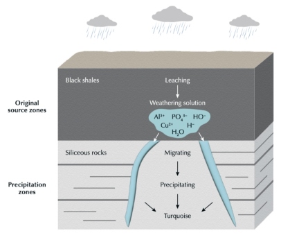研究表明,該礦點(diǎn)綠松石的地球化學(xué)特征以高Li、V、Cr、Sr、Ga和低Ba為顯著特征,典型的雜質(zhì)礦物有石英、磷灰石、硫磷鋁鍶石、針鐵礦、赤鐵礦、黃鉀鐵釩、三水膽礬、白云母、石膏等。其中氯銅礦作為該產(chǎn)地的標(biāo)志性礦物,可與中國(guó)其他產(chǎn)地綠松石區(qū)分開(kāi),具有重要的產(chǎn)地鑒別意義。本研究揭示了黑色巖系是綠松石成礦的主要物質(zhì)來(lái)源,并提出該綠松石礦屬于表生風(fēng)化淋濾成因。