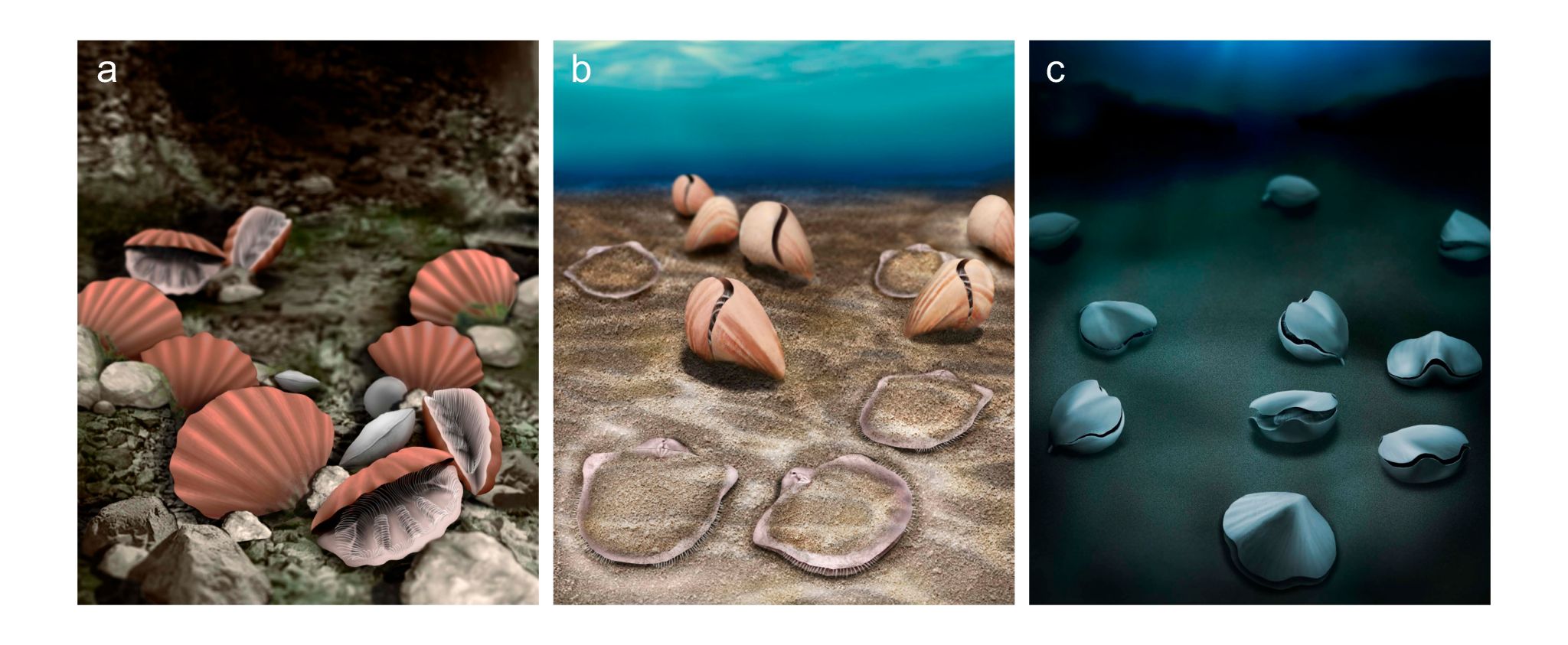 圖4 中—新生代部分腕足動(dòng)物生態(tài)恢復(fù)圖。石順義繪制