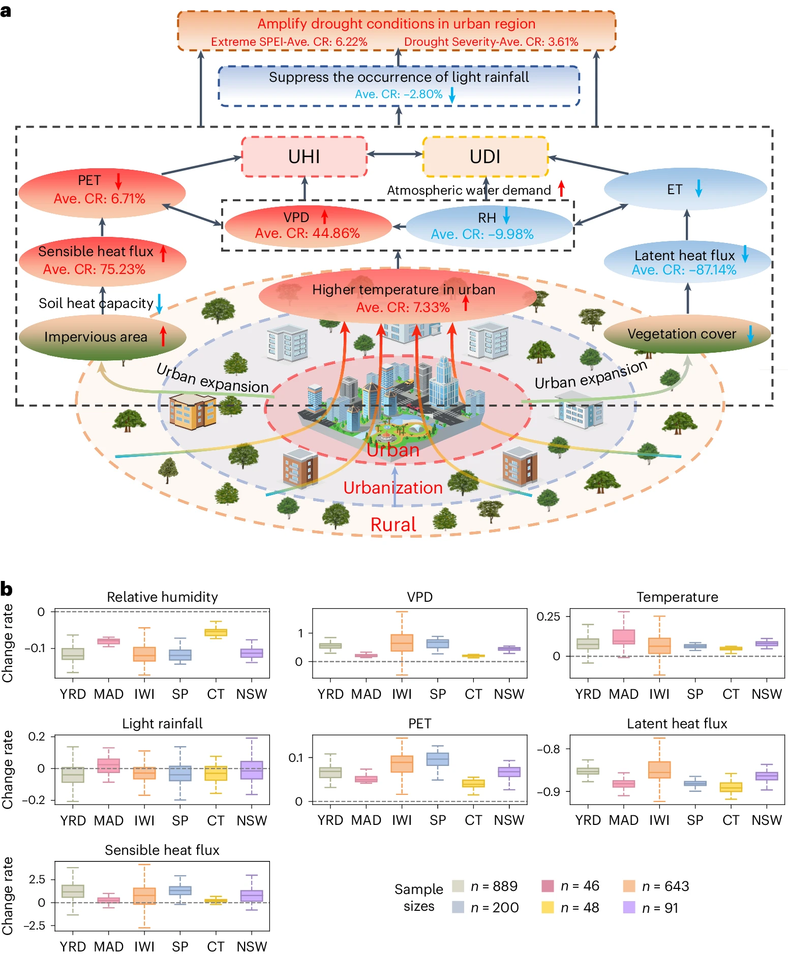 本研究通過對城市化與局地干旱的關聯的全面分析,定量揭示了城市化影響下極端干旱的加劇,并探討了潛在機制。隨著城市擴展和人口增長的持續,這些發現將增強對城市化在局地干旱發生發展過程中的作用的理解,為城市干旱的防災減災以及城市可持續發展提供理論支撐。