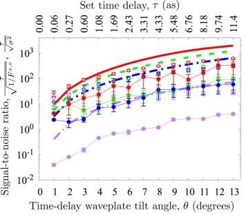 圖中包括理論散粒噪聲極限(粗線)、實驗散粒噪聲極限(帶誤差條的數據點),以及實驗信噪比(帶統計誤差條的引導線和數據點)。其中,紅色、綠色和藍色分別對應不同的弱值放大技術設定,紫色數據代表傳統干涉儀方案。