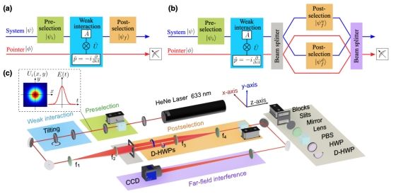 圖一 “弱值放大技術 + 干涉測量”原理圖和原理驗證實驗方案。