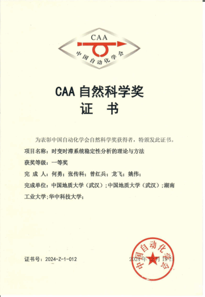 5月25日,2024年度中國自動化學會科學技術獎勵頒獎儀式在北京舉行。由自動化學院何勇教授、張傳科教授為第一、第二完成人的科研成果“時變時滯系統穩定性分析的理論與方法”榮獲自然科學獎一等獎。