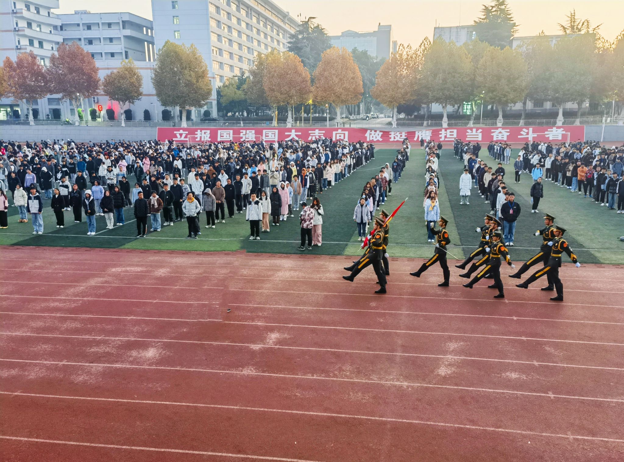 學(xué)校高度重視學(xué)生早鍛煉,校黨委副書記王甫現(xiàn)場(chǎng)觀摩早鍛煉并主持本學(xué)期第一次升旗儀式。自10月10日早鍛煉啟動(dòng)以來,本科生院、黨委宣傳部、校團(tuán)委等職能部門和廣播臺(tái)、場(chǎng)地管理中心、國(guó)旗班、軍樂團(tuán)等學(xué)生組織通力合作,有力保障早鍛煉順利進(jìn)行。各學(xué)院領(lǐng)導(dǎo)班子、輔導(dǎo)員老師積極出勤,陪伴學(xué)生成長(zhǎng)、關(guān)愛學(xué)生發(fā)展。