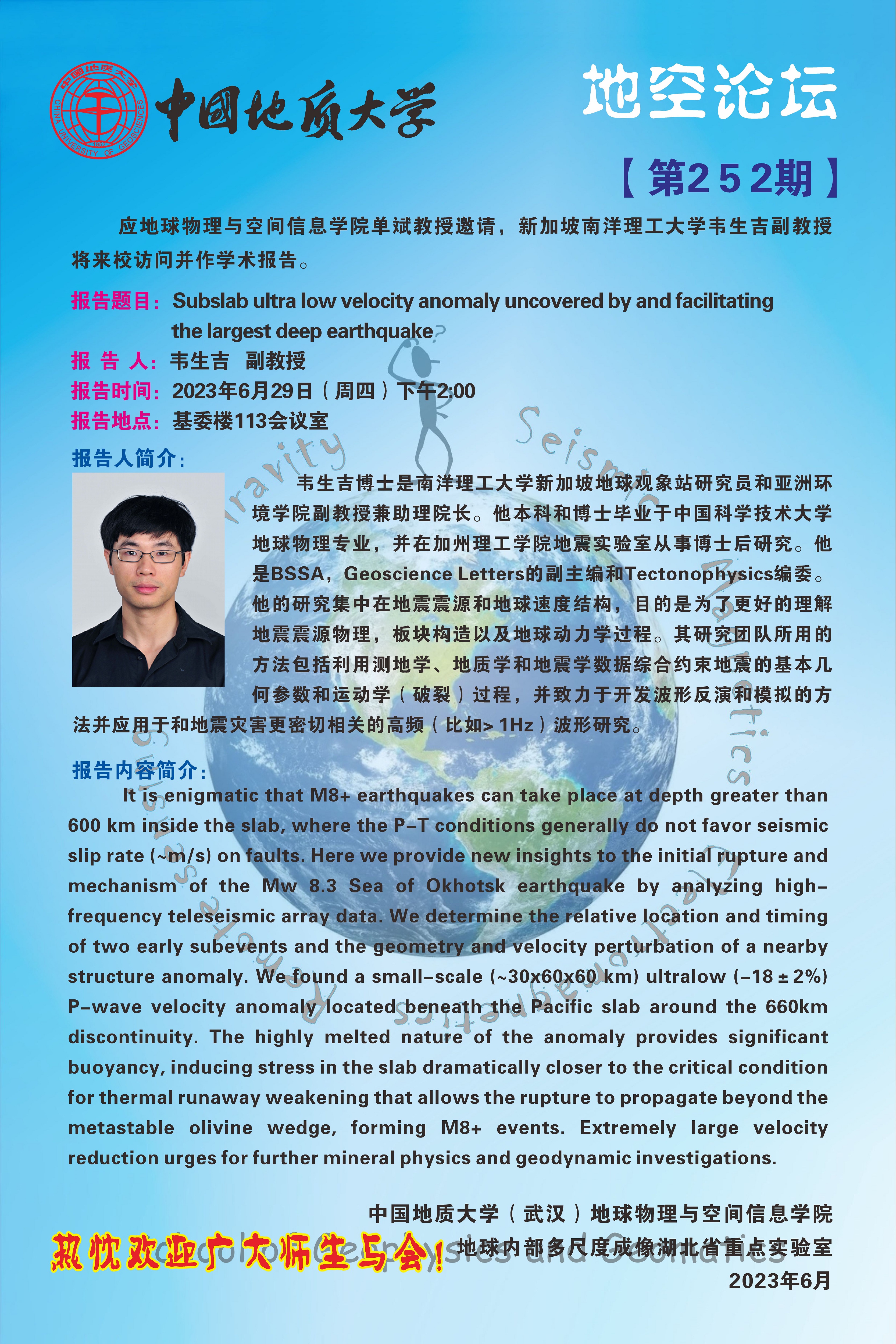 【6月29日】地空論壇:Subslab ultra low velocity anomaly uncovered by and facilitating the largest deep earthquake