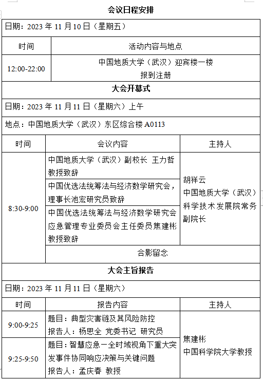 本次會議由中國優選法統籌法與經濟數學研究會應急管理專業委員會、中國科學院大學、中國科學院科技戰略咨詢研究院、中國地質大學(武漢)聯合主辦。中國地質大學(武漢)經濟管理學院、公共管理學院、工程學院、科學技術發展院聯合承辦,計劃于2023年11月10-12日在湖北武漢召開。會議地址:湖北省武漢市洪山區魯磨路388號中國地質大學(武漢)南望山校區。