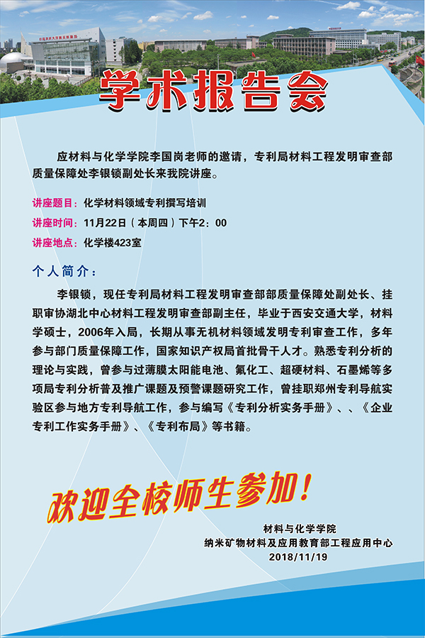 [11月22日]材化學(xué)術(shù)論壇:專(zhuān)利局材料工程發(fā)明審查部質(zhì)量保障處李銀鎖副處長(zhǎng)學(xué)術(shù)報(bào)告