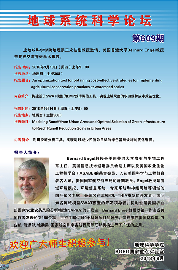 [9月13日]地球系統科學論壇:美國普渡大學Bernard Engel教授學術報告