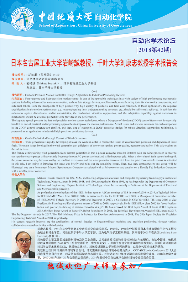 [10月18日]自動化論壇:日本名古屋工業大學巖崎誠教授.千葉大學劉康志教授學術報告