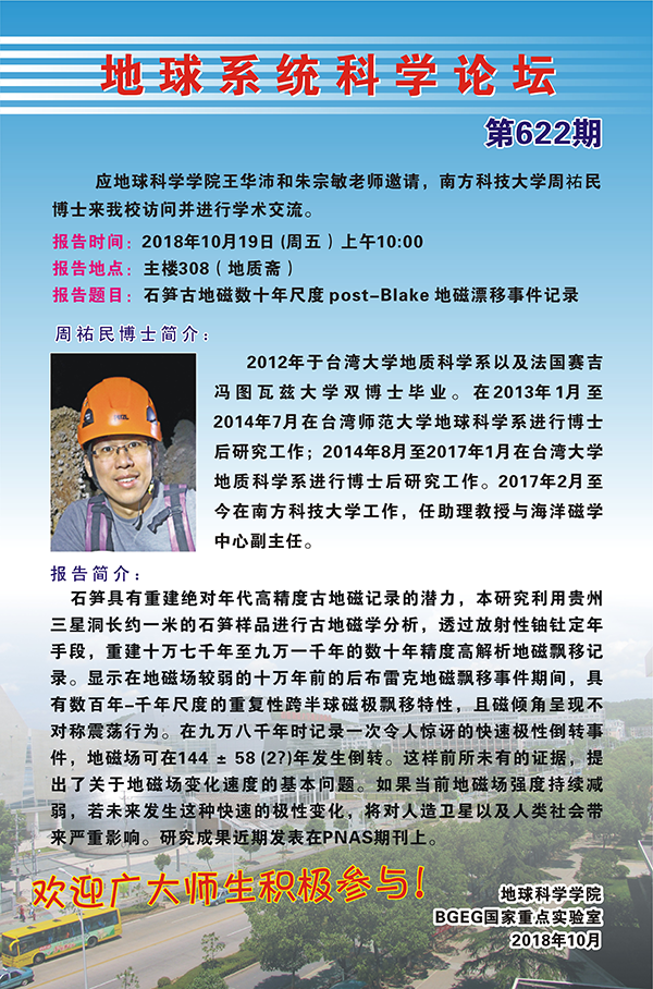 [10月19日]地球系統科學論壇:南方科技大學周祐民博士學術報告