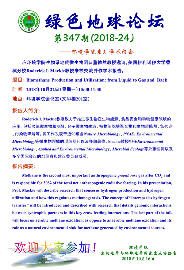 [10月22日]綠色地球論壇:美國伊利諾伊大學香檳分校Roderick I.Mackie教授學術報告